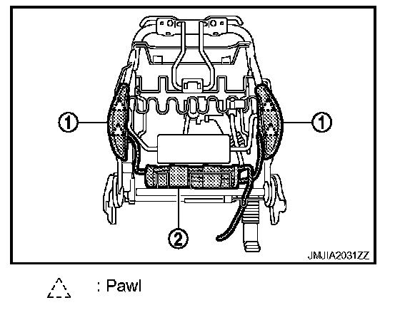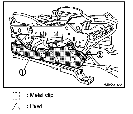 13. Remove the metal clips and pawl, and then pull out seat cushion outer lower finisher outside (1) and inside (2).