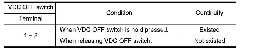 3. Check the continuity between VDC OFF switch connector terminals.