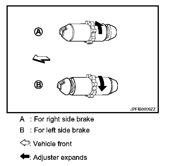 b. Using suitable tool, rotate adjuster (1) in the direction (B) to retract and loosen brake shoe.