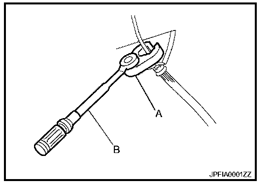 - Tighten the brake tube flare nut to the specified torque with a crowfoot (A) and torque wrench (B).