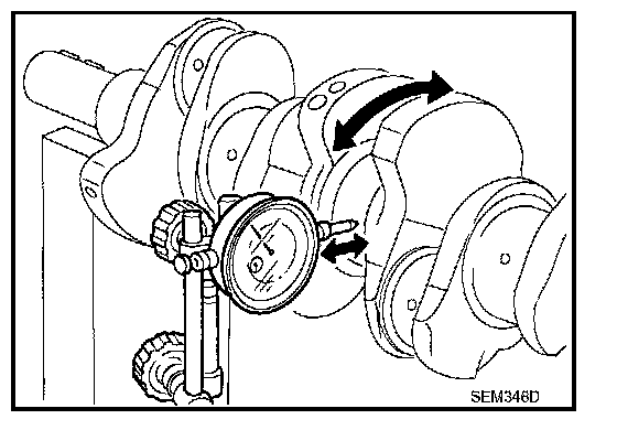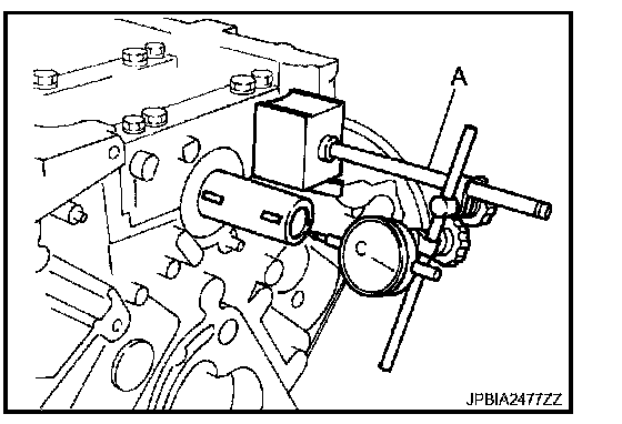 - Measure the clearance between thrust bearings and crankshaft arm when crankshaft is moved fully forward or backward with a dial indicator (A).