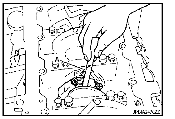 - Install connecting rod bearing cap without installing connecting rod bearing, and tighten connecting rod bolts to the specified torque. Refer to Disassembly and Assembly for the tightening procedure.