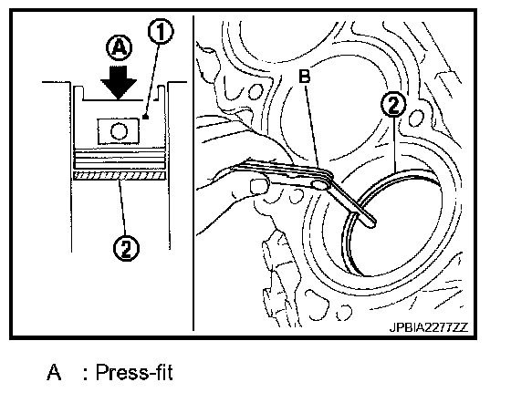- Lubricate with new engine oil to piston (1) and piston ring (2), and then insert piston ring until middle of cylinder with piston, and measure the piston ring end gap with a feeler gauge (B).