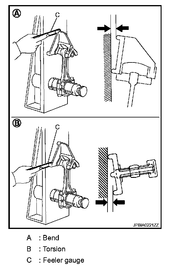 - Measure the side clearance between connecting rod and crankshaft arm with a feeler gauge (A).