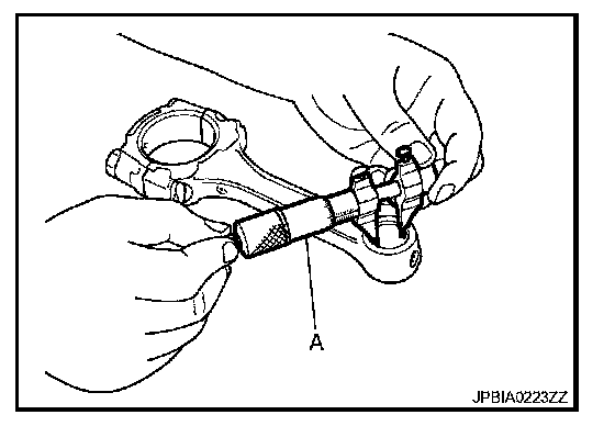 Measure the inner diameter of connecting rod bushing with an inside micrometer (A).