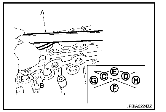 - Measure the distortion on the cylinder block upper face at some different points in six directions (C, D, E, F, G and H) with a straightedge (A) and a feeler gauge (B).