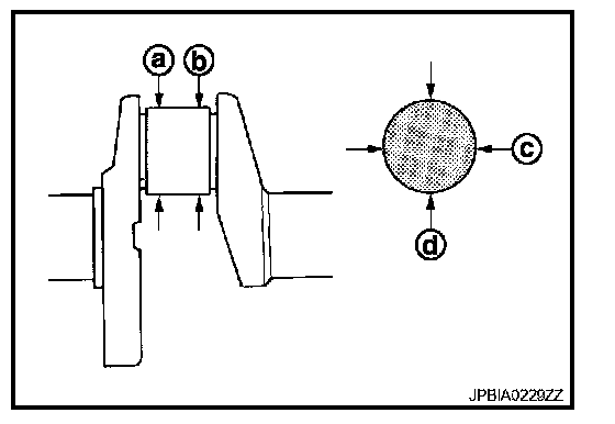 - Measure the dimensions at four different points as shown in the figure on each main journal and pin journal with a micrometer.