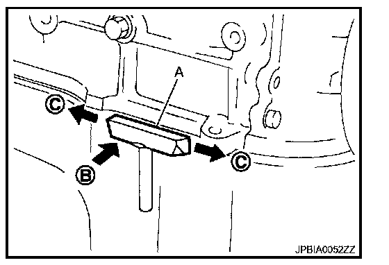 - After removing mounting nuts and bolts, separate the mating surface using the seal cutter [SST:KV10111100 (J-37228)] (A) and remove old liquid gasket sealing.