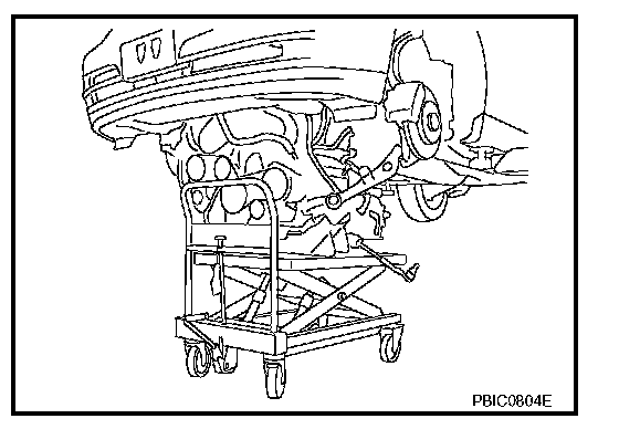 1. Use a manual lift table caddy (commercial service tool) or an equivalently rigid tool such as a transmission jack. Securely support bottom of suspension member and the transmission assembly.
