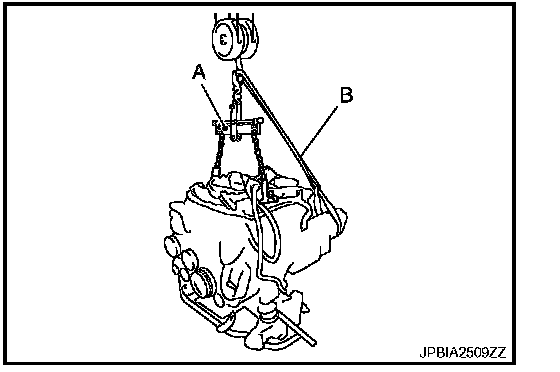 - For the flywheel housing side, use a webbing slinger (B) or an equivalent to hoist the assembly horizontally.