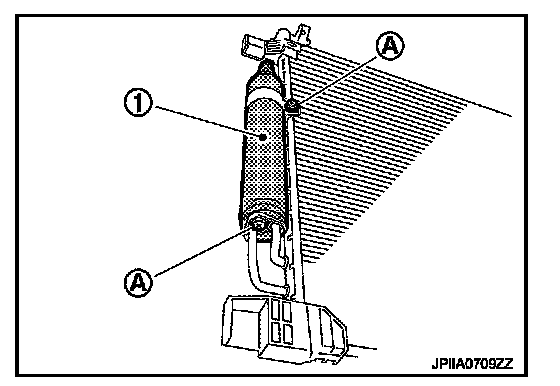 - Check that liquid tank bracket is securely installed at protrusion of condenser. (Check that liquid tank bracket does not move to a position below center of liquid tank.)