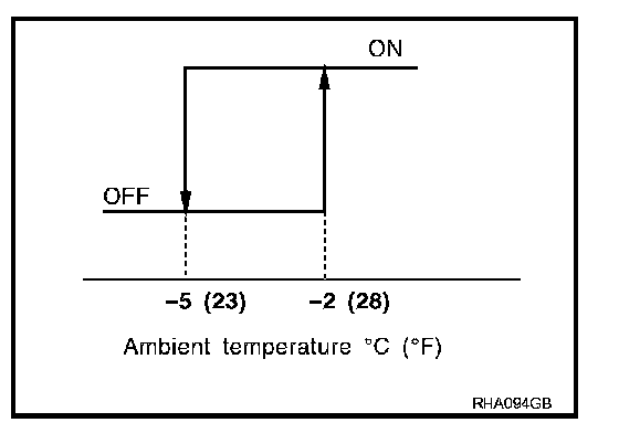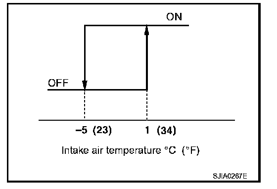 When intake air temperature is higher than 1�C (34�F), the compressor turns ON. The compressor turns OFF when intake air temperature is lower than -5�C (23�F).