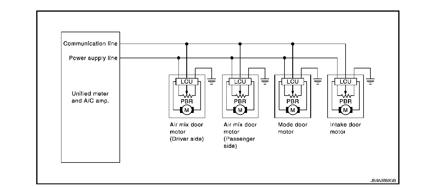 - The air mix door motors, mode door motor and intake door motor read their respective signals according to the address signal. Opening angle indication signals received from the unified meter and A/C amp. and each of the motor position sensors are compared by the LCUs in each door motor with the existing decision and opening angles. Subsequently, HOT/COLD, DEF/VENT and FRE/REC operation is selected. The new selection data are returned to the unified meter and A/C amp.
