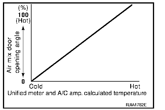 When ignition switch is ON, unified meter and A/C amp. continuously and automatically controls temperatures regardless of air conditioner operational condition. When setting a target temperature with temperature control dial, unified meter and A/C amp. corrects the set temperature and decides a target air mix door opening angle. Unified meter and A/C amp. controls air mix door according to the target air mix door opening angle and current air mix door opening angle for keeping an optimum air mix door opening angle. When a temperature is set at 18.0�C (60�F), air mix door is fixed at full cold, and when a temperature is set at 32.0�C (90�F), it is set at full hot.