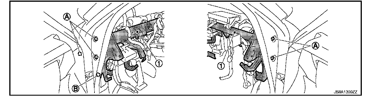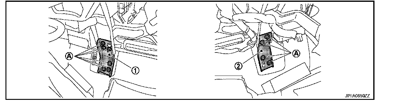 13. Remove mounting nuts (A), and then remove instrument stay (left) (1) and instrument stay (right) (2).