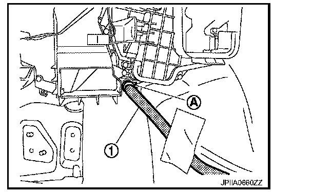 14. Remove clamp (A), and then disconnect drain hose (1).