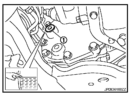 - Remove filler plug (1) and check oil level from filler plug mounting hole as shown in the figure.