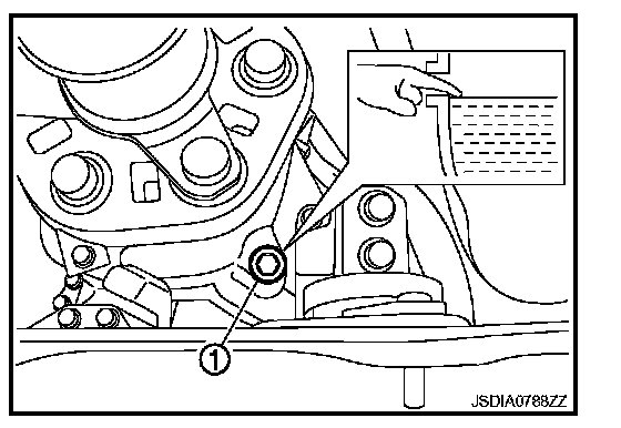 1. Remove filler plug (1) and gasket. Then check that fluid is filled up from mounting hole for the filler plug.