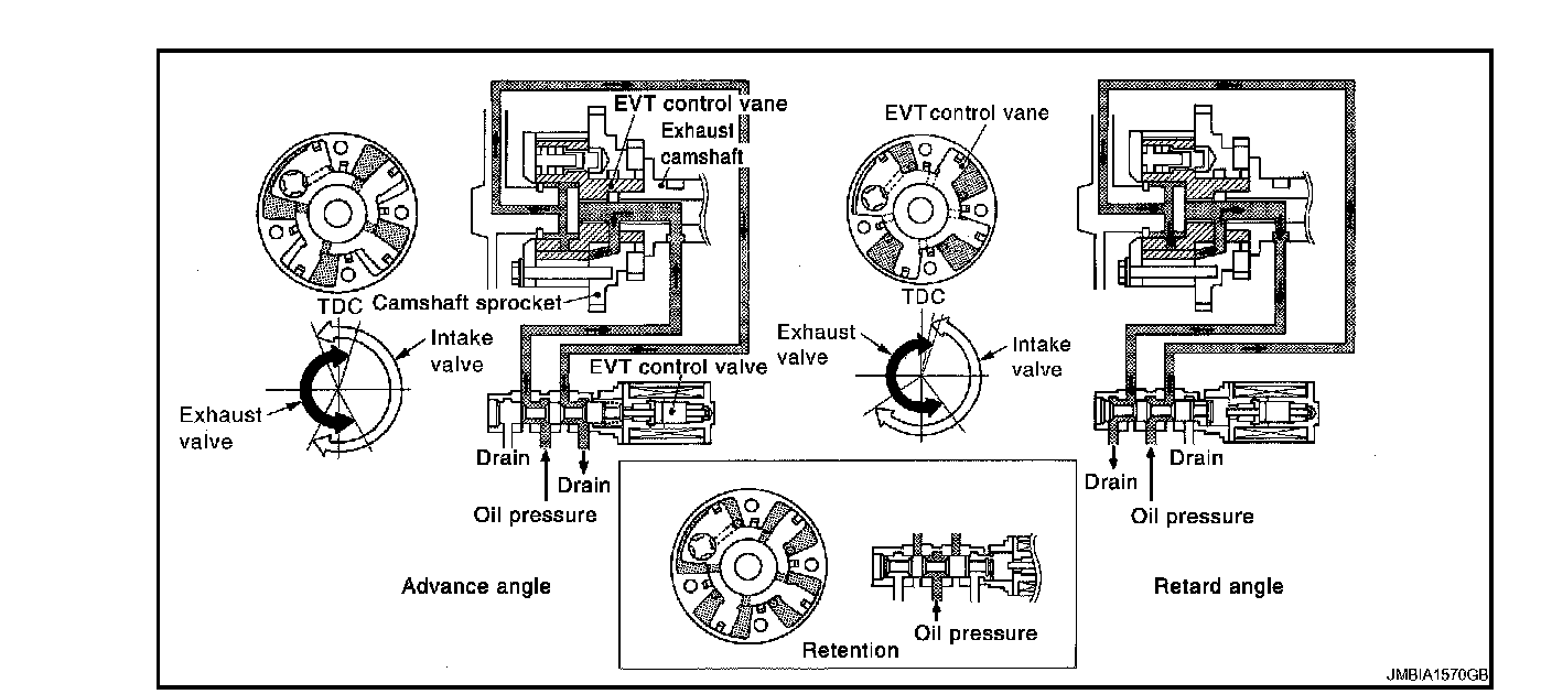 The ECM receives signals such as crankshaft position, camshaft position, engine speed, and engine oil temperature. Then, the ECM sends ON/OFF pulse duty signals to the exhaust valve timing control solenoid valve depending on driving status. This makes it possible to control the shut/open timing of the exhaust valve to increase engine torque and output in a range of high engine speed.