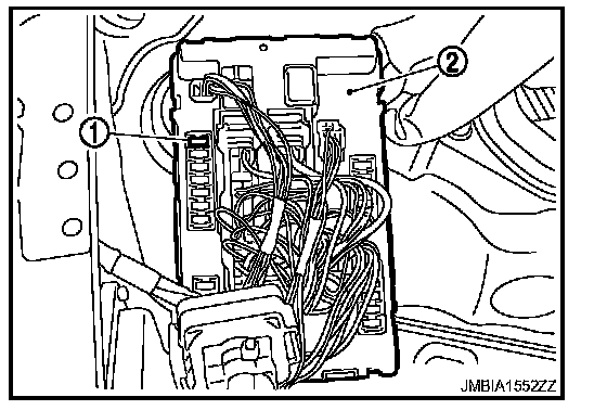 3. Remove fuel pump fuse (1) in IPDM E/R (2) to release fuel pressure.