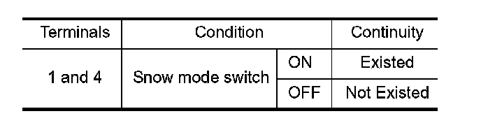 3. Check the continuity between snow mode switch terminals under the following conditions.