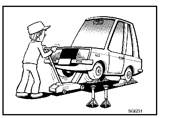 - Before jacking up the vehicle, apply wheel chocks or other tire blocks to the wheels to prevent the vehicle from moving. After jacking up the vehicle, support the vehicle weight with safety stands at the points designated for proper lifting before working on the vehicle.