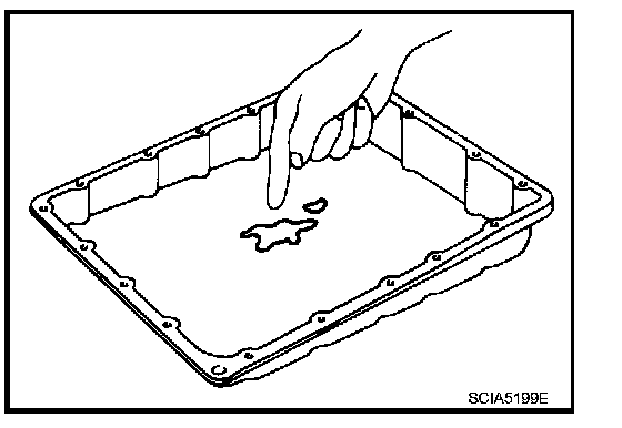 Check foreign materials in oil pan to help determine causes of malfunction. If the ATF is very dark, smells burned, or contains foreign particles, the frictional material (clutches, band) may need replacement. A tacky film that will not wipe clean indicates varnish build up.