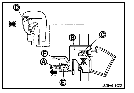 The lock plate (B) lowers according to the downward movement of the position pin (C) when the selector button (D) is pressed, and presses only slider B (E) into the shift lock unit. Slider A (F) located below the lock plate prevents the downward movement of the lock plate with the spring force. The selector lever cannot be shifted from the "P" position for this reason.