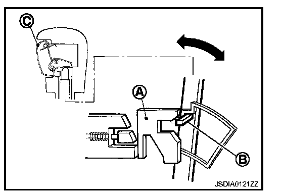 The shift lock solenoid (A) inside the shift lock unit is energized and the relative positions of sliders A (B) and B (C) are maintained when the brake pedal is depressed while the ignition switch is ON.
