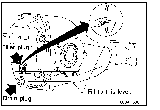 2. Fill the rear final drive assembly with new differential gear oil until the level reaches the specified level near the filler plug hole.
