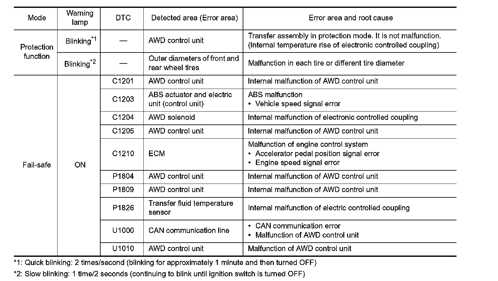- When AWD warning lamp is ON, vehicle changes to rear-wheel drive or shifts to 4-wheel drive (front-wheels still have some driving torque).
