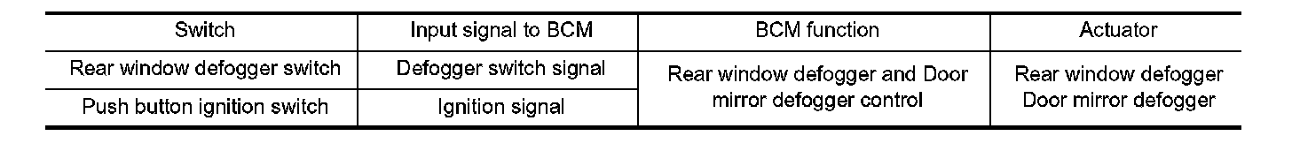 - BCM turns rear window defogger relay ON for approximately 15 minutes when rear window defogger switch turns ON. It makes rear window defogger and door mirror defogger (with mirror defogger) operate.