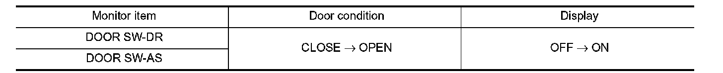 Check door switches ("DOOR SW-DR", "DOOR SW-AS") in "Data Monitor" mode with CONSULT-III.