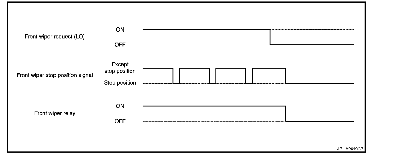 - When the front wiper request signal is stopped, IPDM E/R turns ON the front wiper relay until the front wiper motor returns to the stop position.