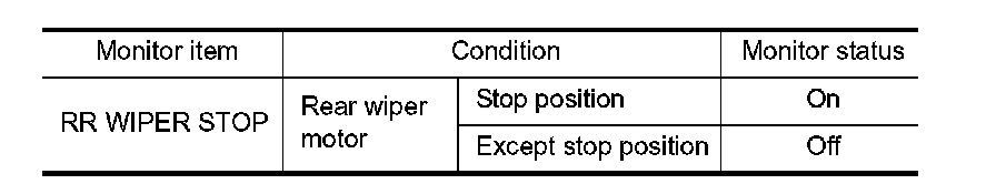 3. Check that "RR WIPER STOP" changes to "On" and "Off" linked with the wiper operation.