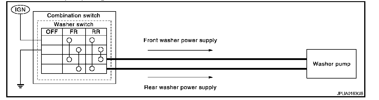 Combination switch switches polarity between front washer operating and rear washer operating to supply power to the washer pump on ground.