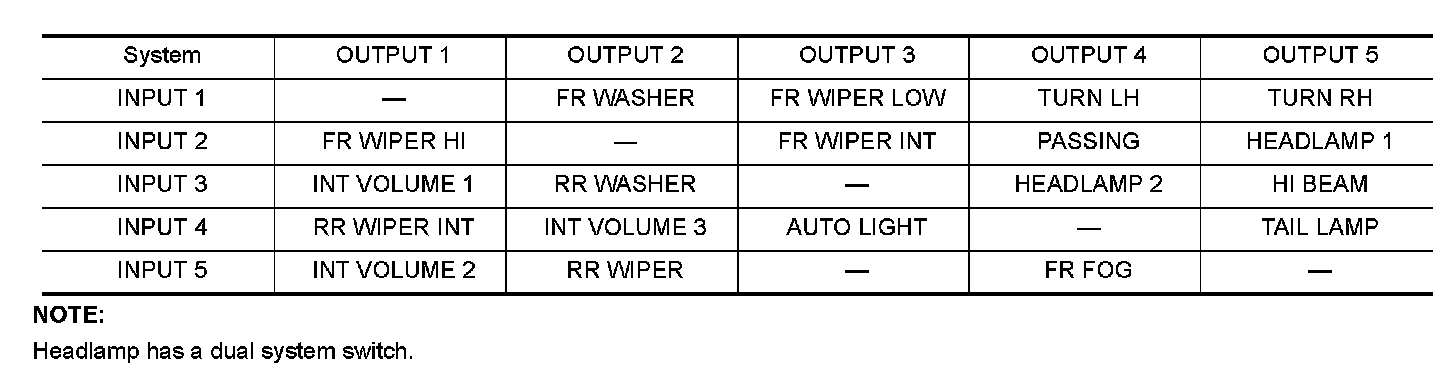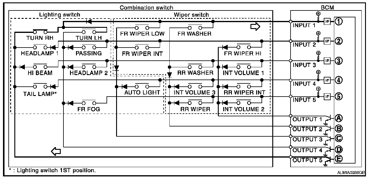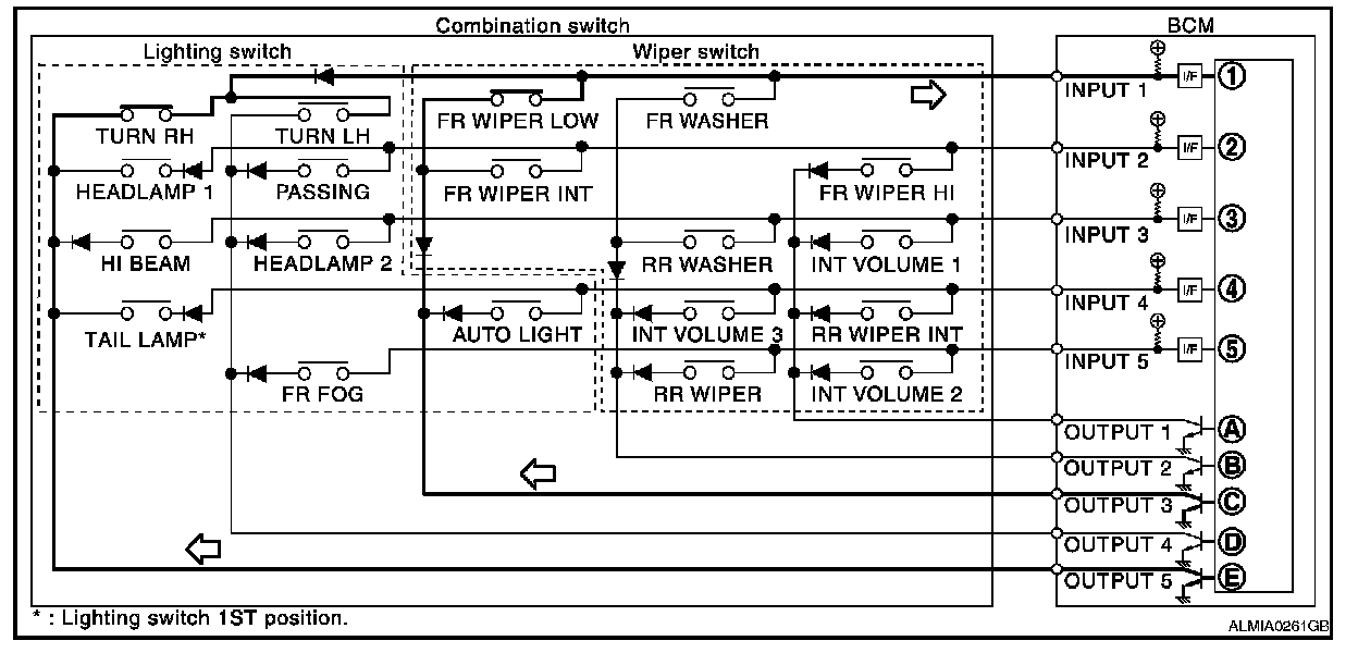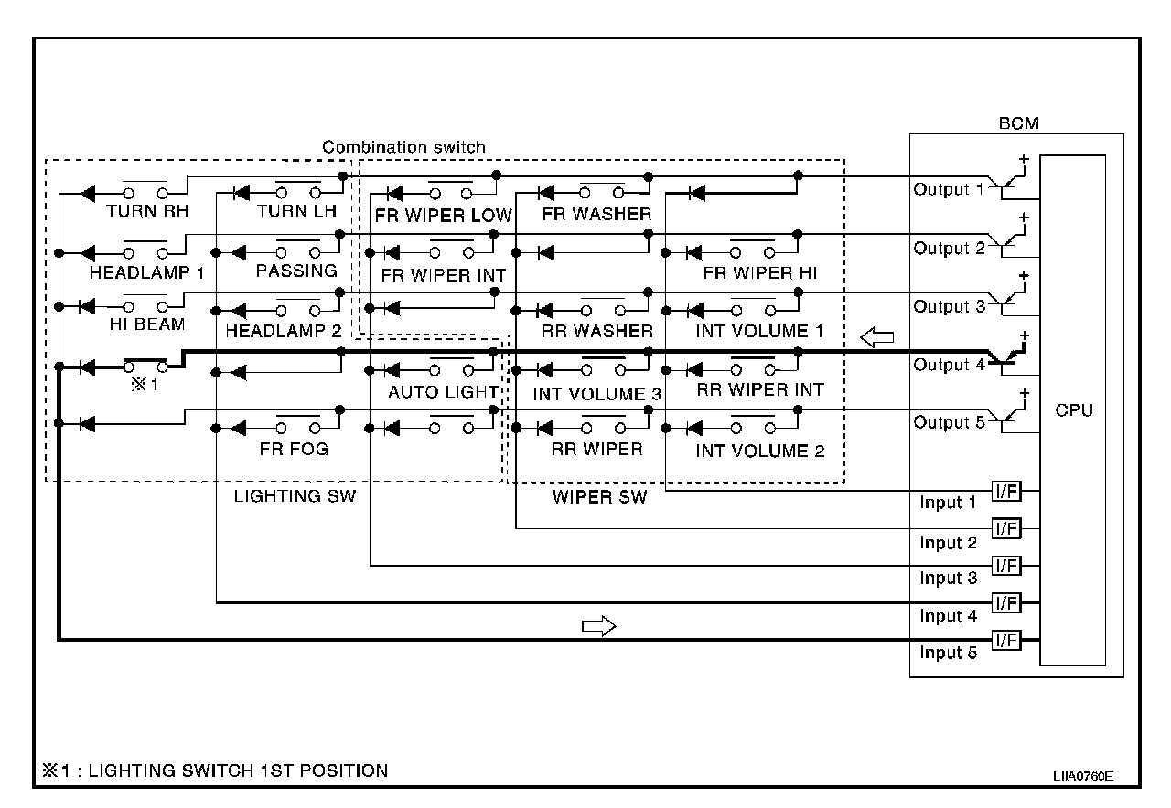- BCM detects the combination switch status signal "1E" when the signal of OUTPUT 5 is input to INPUT 1.