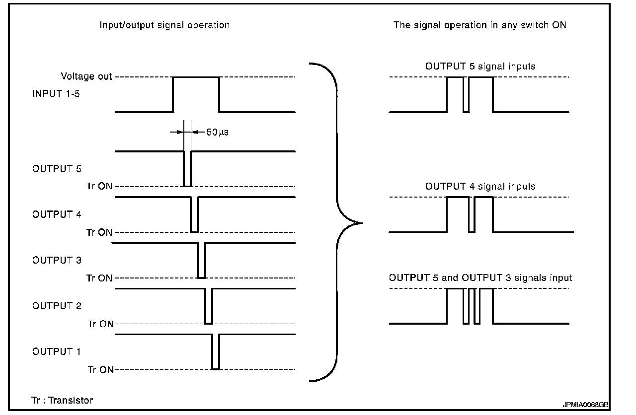 - BCM detects the combination switch status signal "1CE" when the signals of OUTPUT 3 and OUTPUT 5 are input to INPUT 1.