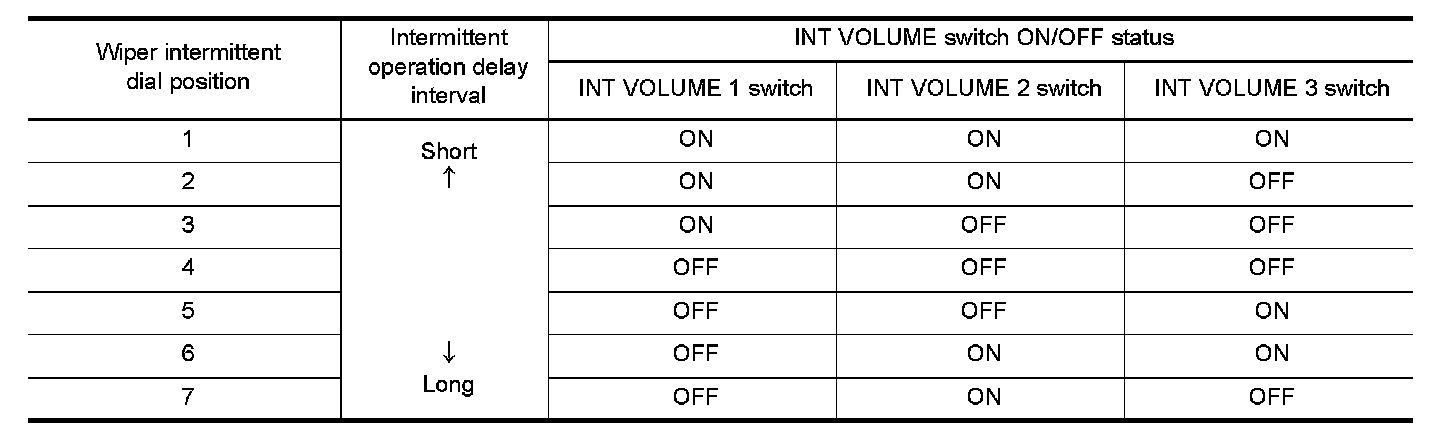 BCM judges the wiper intermittent dial 1 - 7 by the status of INT VOLUME 1, 2 and 3 switches.