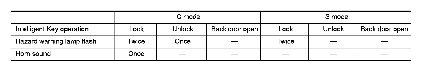When doors are locked or unlocked by Intelligent Key. BCM flashes hazard warning lamps as a reminder and transmits horn chirp signal to IPDM E/R. IPDM E/R sound horns as a reminder.