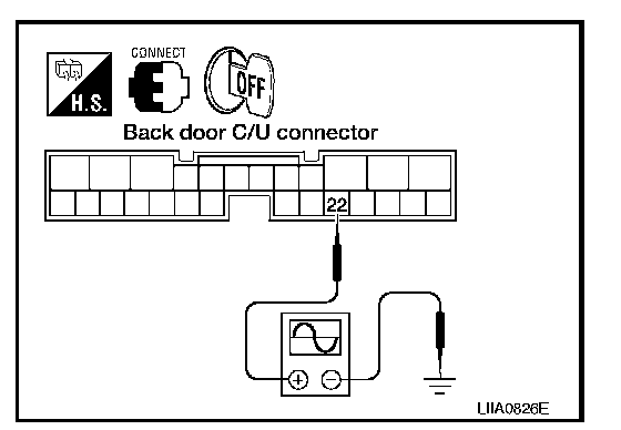 2. While fully opening and closing the back door, check voltage between back door control unit connector B55 terminal 22 and ground.