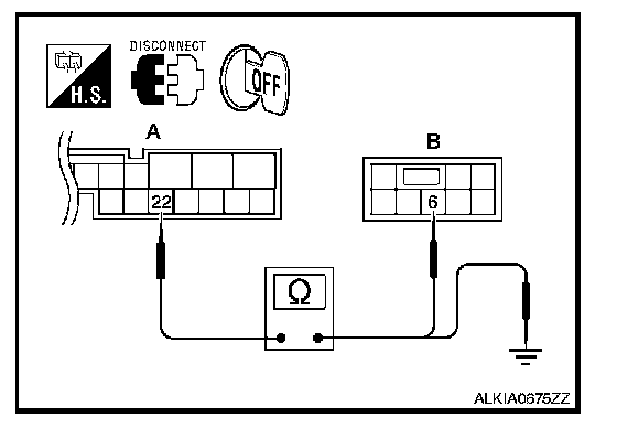3. Check continuity between back control unit connector (A) B55 terminal 22 and ground.