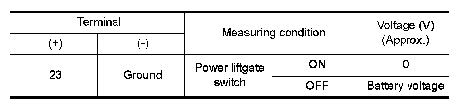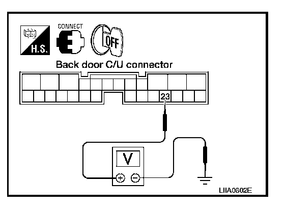 2. While operating the power liftgate switch, check voltage between back door control unit connector B55 terminal 23 and ground.
