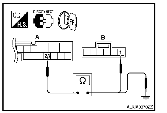 2. Check continuity between back door control unit connector (A)