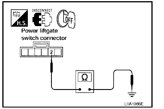 Check continuity between power liftgate switch connector terminal 2 and ground.