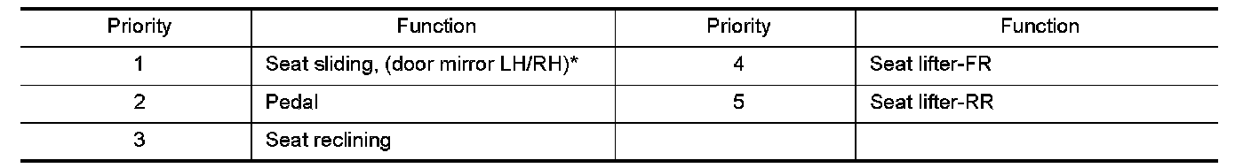 The front seat LH position and pedal adjustment functions (see the following table) operate simultaneously in the order of priority.