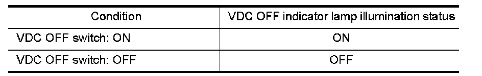 Turn ON/OFF the VDC OFF switch and check that the VDC OFF indicator lamp in the combination meter turns