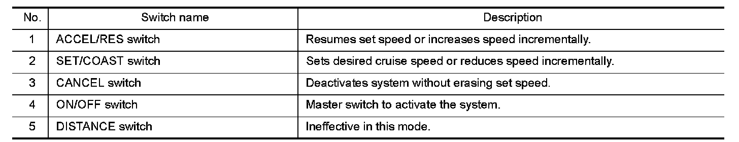 The on board self-diagnosis function of the ICC system can be started with the RESUME/ACCELERATE switch and SET/COAST switch. Refer to Diagnosis Description.