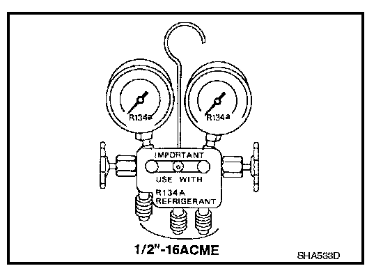 Be certain that the gauge face indicates R-134a or 134a. Make sure the gauge set has 1/2"-16 ACME threaded connections for service hoses. Confirm the set has been used only with refrigerant HFC-134a (R-134a) along with specified oil.