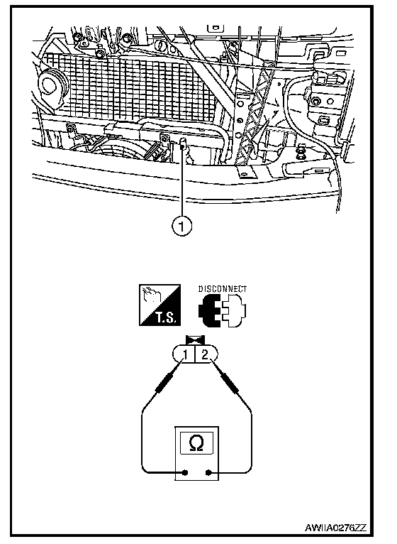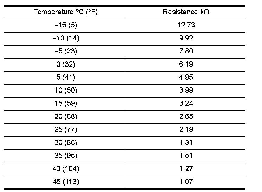 After disconnecting ambient sensor (1) connector E1, measure resistance between terminals 1 and 2 at sensor component side, using the table below.